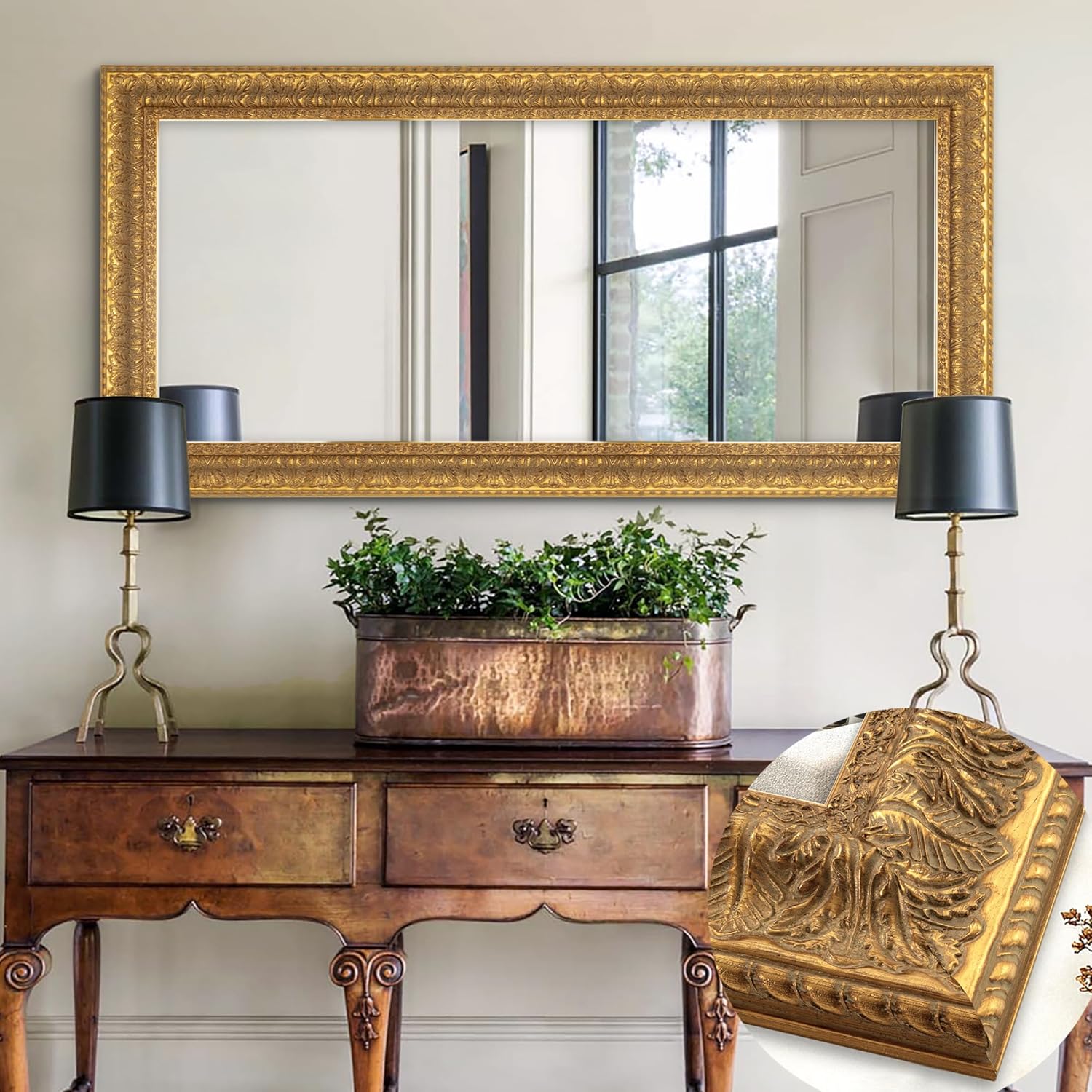 Chende 48" L x 24" W Large Gold Mirror for Wall, Rectangular Decorative Mirror Wall Decor with Leaves Shape Wood Frame, Elegant Baroque Mirror for Bathroom Entrance Hallyway Power Room