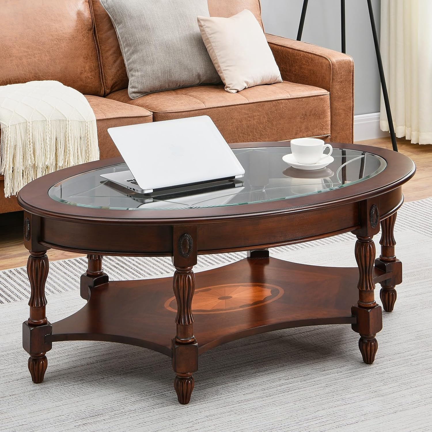 Large Oval Coffee Table with Tempered Glass for Living Room, Cocktail Table with Open Storage Shelf, Modern Sofa Center Table for Office, No-Tools Assembly Cherry Walnut KFZ1533GT
