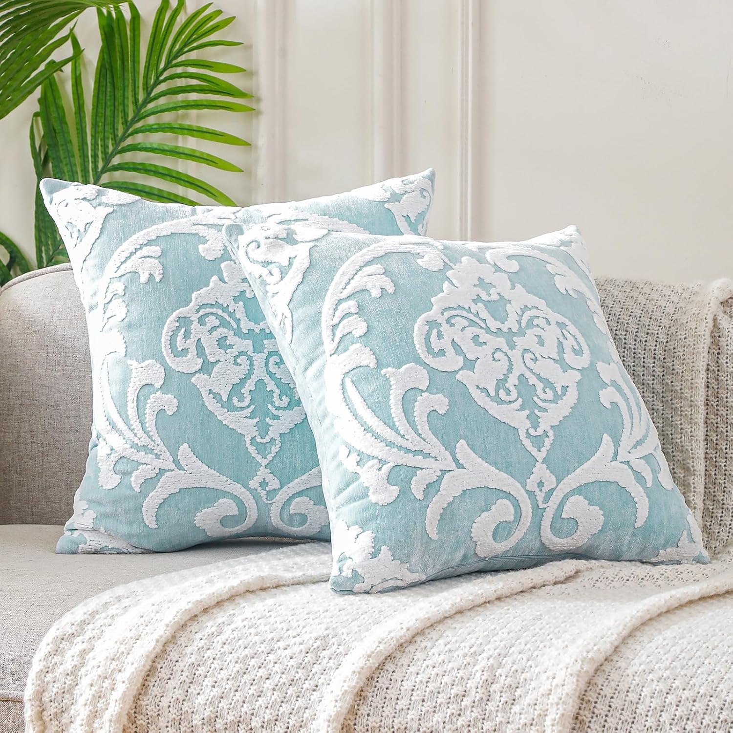 YOUR SMILE Classical Embroidery Jacquard Teal Leaf Pattern Square Decorative Throw Pillow Case Cushion Cover 18x18 inch