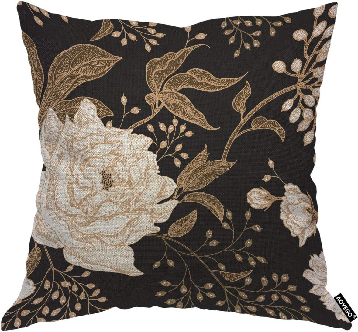 AOYEGO Peonies and Roses Throw Pillow Cover Gold and White Flower Leaves Foliage Berries Oriental Style Luxury Bloom Pillow Case 18x18 Inch Decorative Men Women Room Cushion Cover for Couch