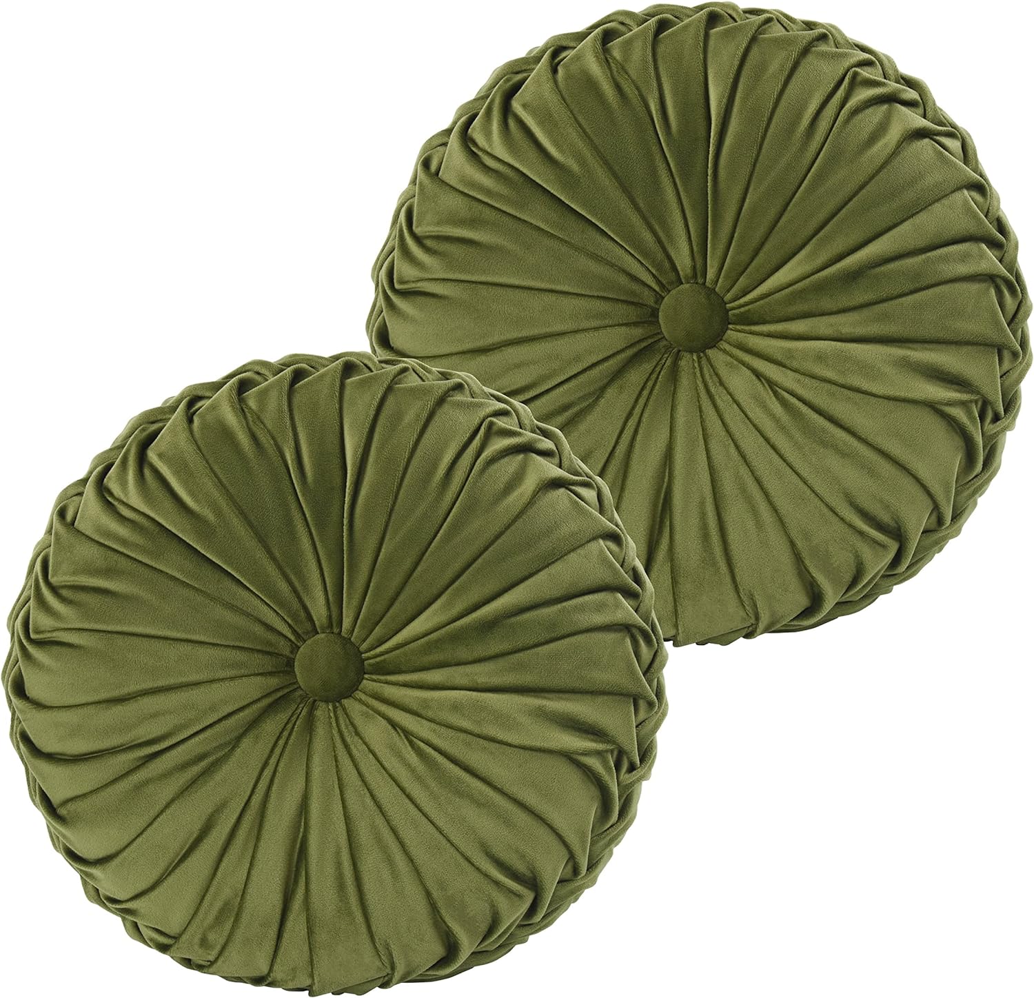 HIG Set of 2 Decorative Round Pleated Throw Pillows, Classy Accent Pumpkin Throw Pillows with Center Button, Vintage Velvet Floor Pillows for Sofa Couch Vanity Chair Bed, Olive, 14.5" Diameter(Ripple)