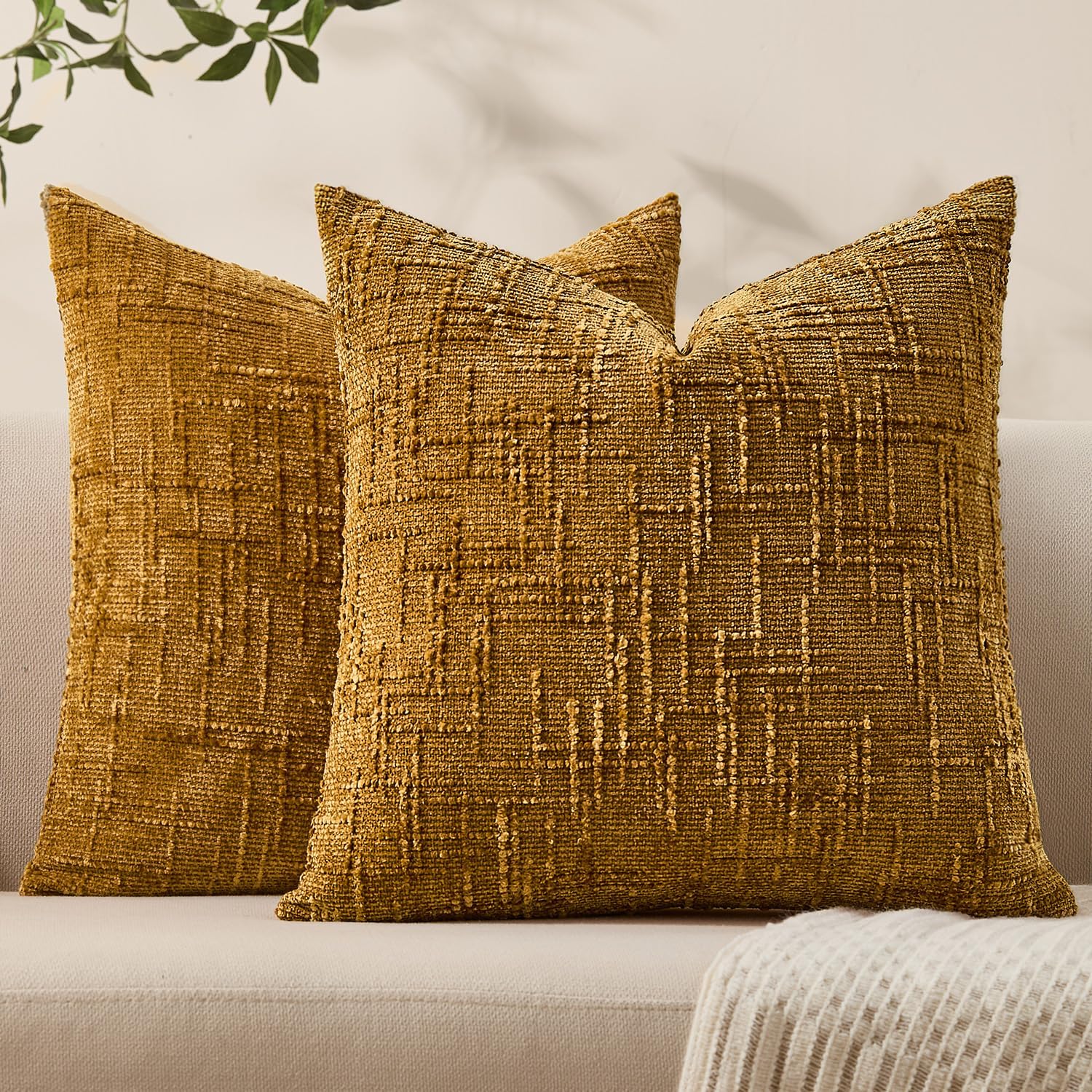 Summer Decorative Couch Throw Pillow Covers 18x18 Set of 2 Yellow Soft Chenille Pillow Covers Neutral Textured Boho Cushion Covers for Modern Farmhouse Sofa Bedroom Living Room Decor SY008-C18
