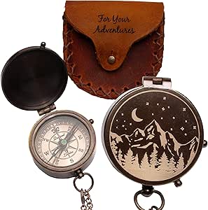 Antique Brass Compass with Leather Case - Mountains & Roads Engraved Pocket Compass for Men - Genuine Leather Pouch Stamped with 'For Your Adventures' - Vintage Gift for Husband, Father & Son